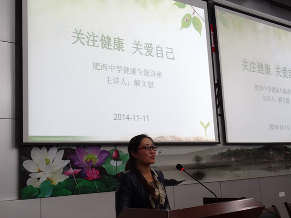 11月11日下午,肥西中学邀请了合肥名流健康体检中心解文慰医生一行,来校作了“关注健康 关爱自己”的健康专题讲座。全体教职员工聆听了这次有意义的讲座。