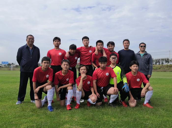 副校长姚家驹,教练员汪荣森、卫杰与足球队成员合影