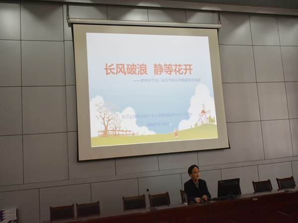 高考是一场没有硝烟的战役,考生们正在紧张地复习准备,家长们也承受着巨大的心理压力。为了缓解家长的紧张焦躁情绪,肥西中学举行2019届高三部分学生家长会,肥西县校外未成年人心理健康辅导中心负责人、国家二级心理咨询师王国松应邀做题为“长风破浪 静待花开”的考前心理健康教育主题讲座。