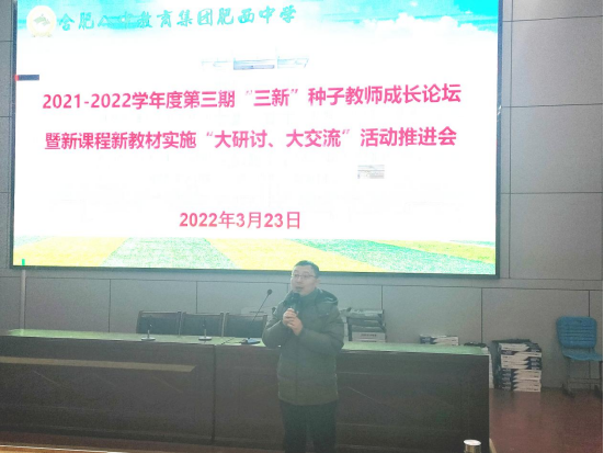 3月23日,为促进种子教师专业成长,全面落实“三新”改革,推广教学教研成果,合肥八中教育集团肥西中学在西报告厅召开了本学年第三期种子教师成长论坛暨新课程新教材“大研讨、大交流”活动推进会。高一高二备课组长及全体种子教师团队成员参加了会议。会议由副校长汪飞主持。