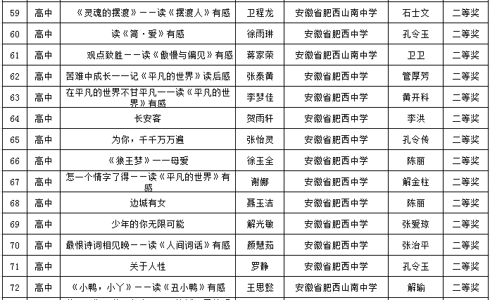 合肥市第十三届“暑假读一本好书”读书征文活动评选结果已于近日揭晓,肥西县高中组作品获奖总计136人次,其中,肥西中学作品获奖高达115人次,一等奖23人,二等奖42人,三等奖50人。